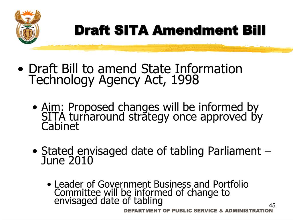 Draft SITA Amendment Bill Draft Bill to amend State Information Technology Agency Act, 1998 Aim: Proposed changes will be informed by SITA turnaround strategy once approved by Cabinet Stated envisaged date of tabling Parliament – June 2010 Leader of Government Business and Portfolio Committee will be informed of change to envisaged date of tabling 45 DEPARTMENT OF PUBLIC SERVICE & ADMINISTRATION