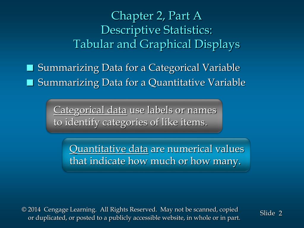 Chapter 2, Part ADescriptive Statistics:Tabular and Graphical Displays • Summarizing Data for a Categorical Variable • Summarizing Data for a Quantitative Variable Categorical data use labels or names to identify categories of like items. Quantitative data are numerical values that indicate how much or how many.