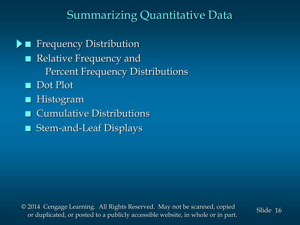 Summarizing Quantitative Data • Frequency Distribution • Relative Frequency and Percent Frequency Distributions • Dot Plot • Histogram • Cumulative Distributions • Stem-and-Leaf Displays