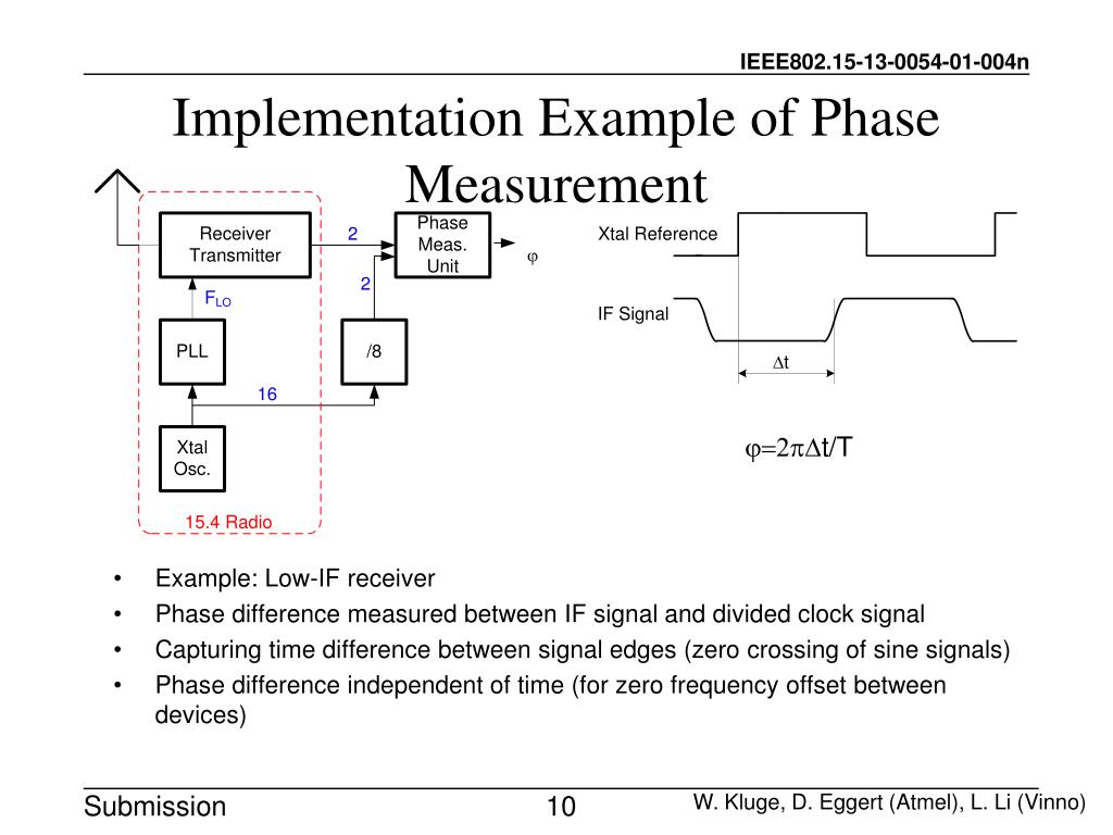Implementation Example of Phase Measurement • Example: Low-IF receiver • Phase difference measured between IF signal and divided clock signal • Capturing time difference between signal edges (zero crossing of sine signals) • Phase difference independent of time (for zero frequency offset between devices) W. Kluge, D. Eggert (Atmel), L. Li (Vinno)