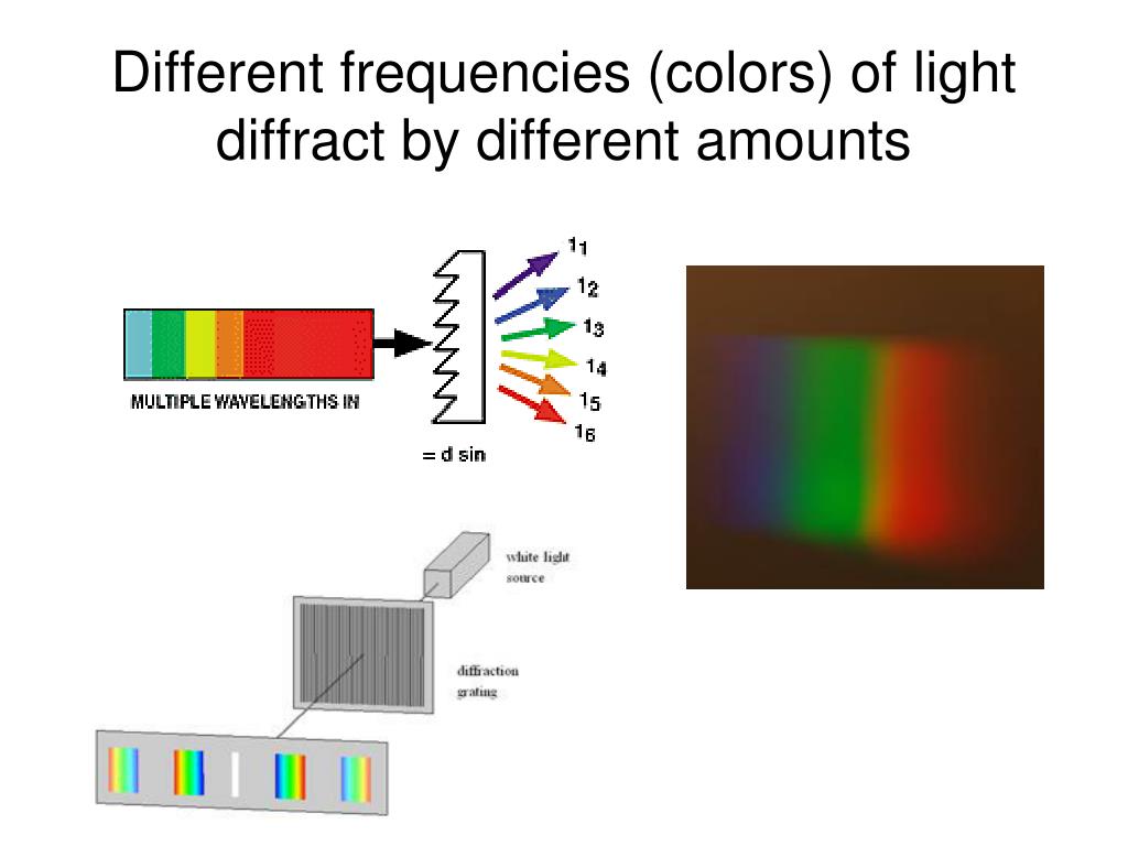 Different frequencies (colors) refract slightly different amounts. This means that the index of refraction, “n”, for blue light is slightly different than “n” for red light. This results in a dispersions of colors as seen in a prism or a rainbow. Blue Bends Best! (ok, actually violet refracts the most…)