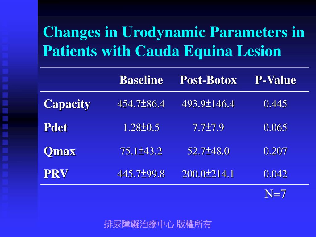 Evaluation of Treatment Outcome • Subjectively improved in voiding efficiency • Increase in voided volume • Reduction of residual urine volume • Decrease of voiding pressure (detrusor or abdominal pressure) • Decrease in frequency of catheterization • Removal of indwelled Foley catheter