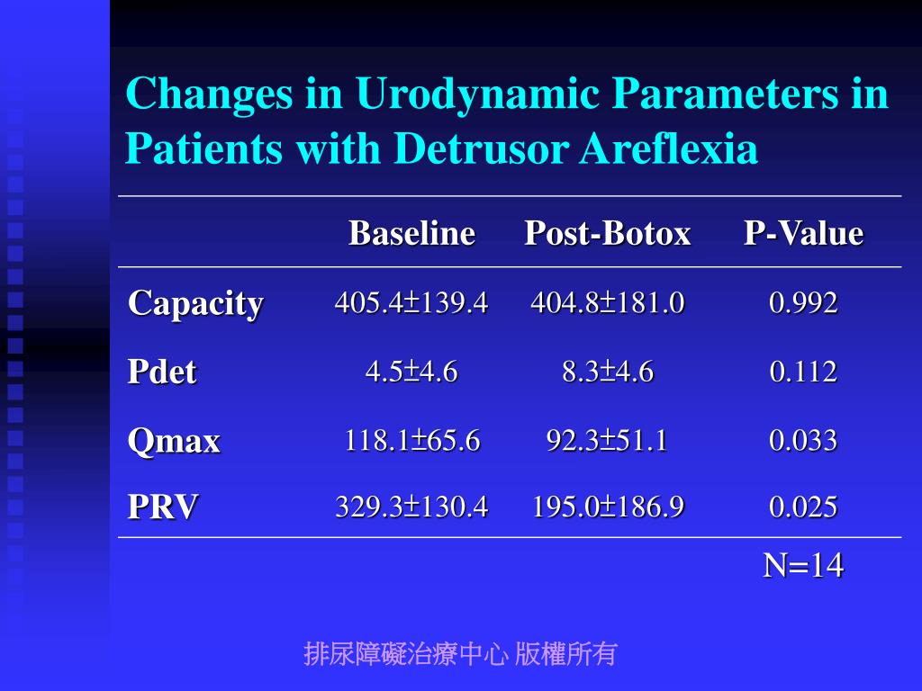Changes in Urodynamic Parameters in Patients with Detrusor Areflexia