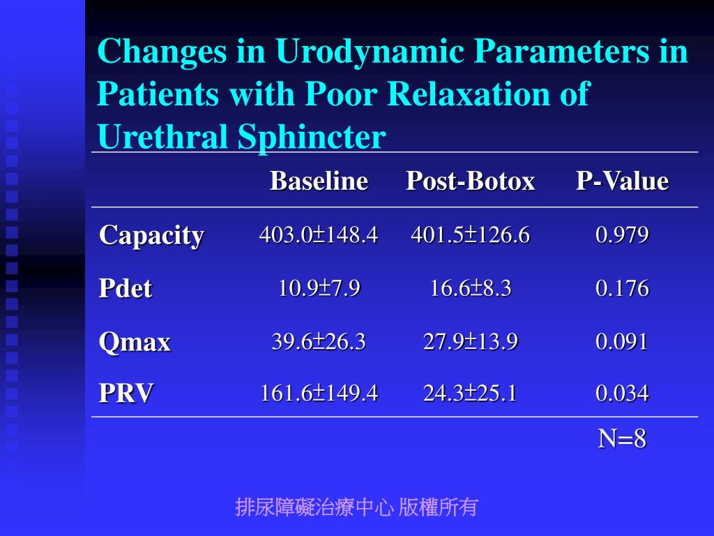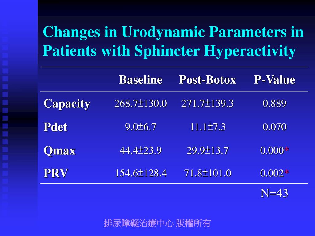 Patients suitable for Botulinum A toxin Treatment • Patients with voiding dysfunction who were refractory to medication or behavioral therapy • Chronic SCI & DESD with low empty efficiency • Cauda equina lesion and difficult urination • Peripheral neuropathy and difficult urination • Dysfunctional voiding • Idiopathic detrusor underactivity • Poor relaxation of urethral sphincter
