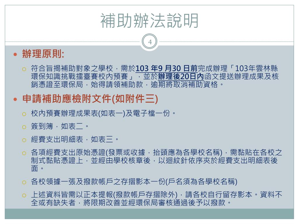 103年環保知識挑戰擂臺賽 雲林縣校內預賽補助原則