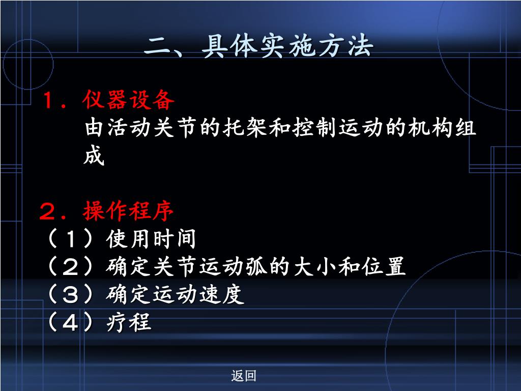 二、具体实施方法 1.仪器设备 由活动关节的托架和控制运动的机构组 成 2.操作程序 (1)使用时间 (2)确定关节运动弧的大小和位置 (3)确定运动速度 (4)疗程 返回