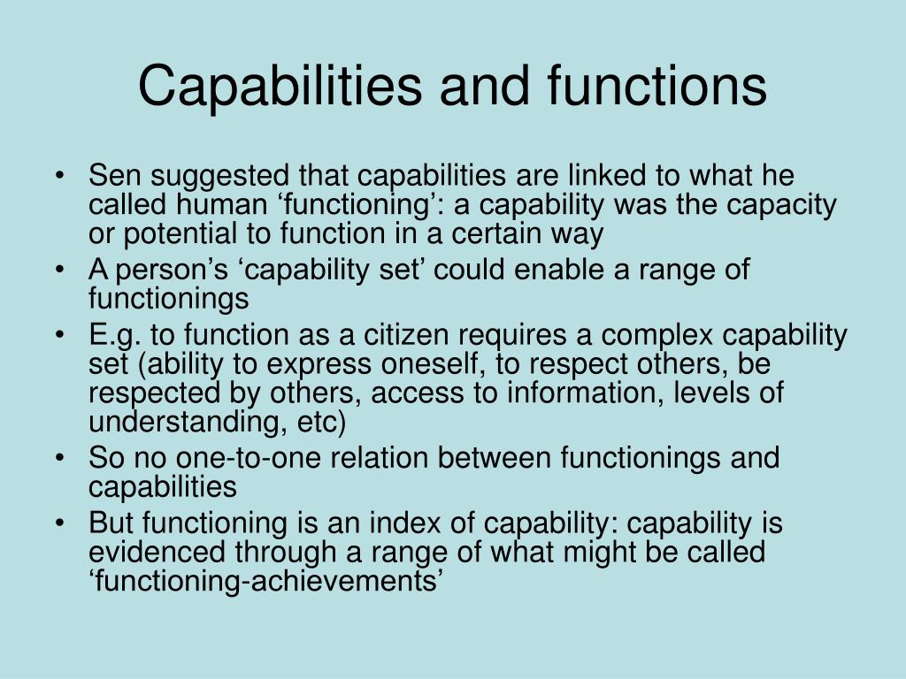 Capabilities and functions • Sen suggested that capabilities are linked to what he called human ‘functioning’: a capability was the capacity or potential to function in a certain way • A person’s ‘capability set’ could enable a range of functionings • E.g. to function as a citizen requires a complex capability set (ability to express oneself, to respect others, be respected by others, access to information, levels of understanding, etc) • So no one-to-one relation between functionings and capabilities • But functioning is an index of capability: capability is evidenced through a range of what might be called ‘functioning-achievements’