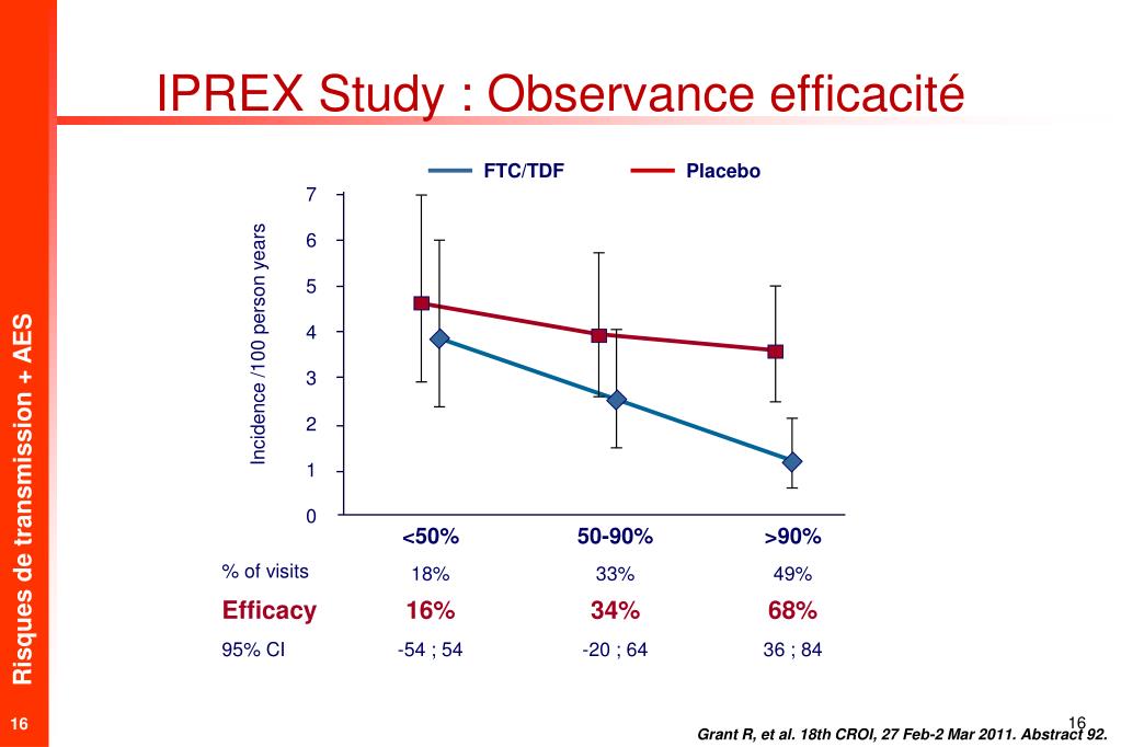 IPREX Study : Observance efficacité FTC/TDF Placebo 7 6 5 4 Incidence /100 person years 3 2 1 0 <50% 50-90% >90% % of visits 18% 33% 49% Efficacy 16% 34% 68% 95% CI -54 ; 54 -20 ; 64 36 ; 84 Grant R, et al. 18th CROI, 27 Feb-2 Mar 2011. Abstract 92.