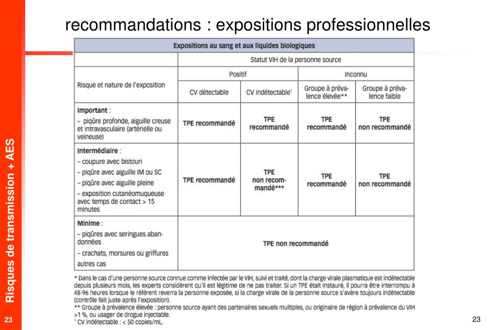 Probabilité de transmission (PT) et recommandations : autres expositions * La balance bénéfice-risque n’est pas en faveur de la mise en route d’un traitement prophylactique, sauf dans des situations particulières qui sont à évaluer après consultation d’un avis spécialisé. Par ailleurs, il est recommandé que le sujet exposé soit pris en charge avec un dépistage initial et orienté pour un suivi clinique et sérologique, et, dans un souci pédagogique, de lui fournir un conseil sur son comportement face au risque d’infection à VIH. ** Morsures, griffures, contacts sanguins sur peau intacte, contact de quelques gouttes de sang sur muqueuse ou peau lésée, contact avec un autre liquide biologique (exemples : salive, urines, …) Circulaire DGS/DHOS/DRT/DSS/SD6 A n° 2003/165 du 2 avril 2003.