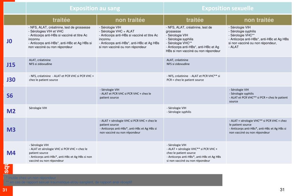 * inutile chez un non répondeur ** en cas de rapport sexuel traumatique et/ou sanglant, de rapport anal réceptif