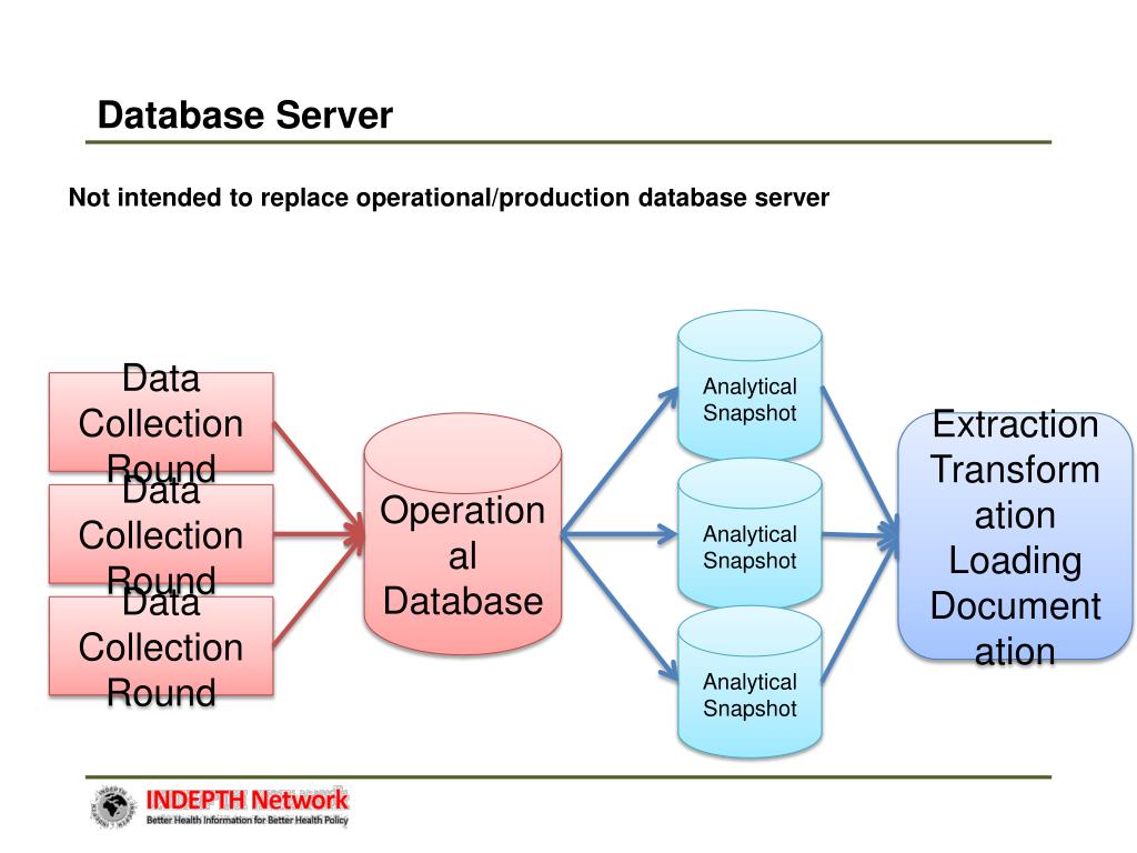 Database Server • Not intended to replace operational/production database server Analytical Snapshot Data Collection Round Operational Database Extraction Transformation Loading Documentation Analytical Snapshot Data Collection Round Data Collection Round Analytical Snapshot
