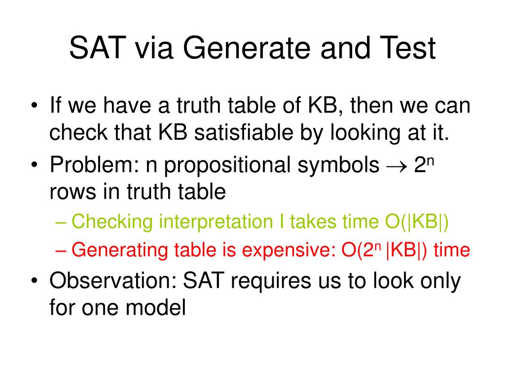 SAT via Generate and Test • If we have a truth table of KB, then we can check that KB satisfiable by looking at it. • Problem: n propositional symbols 2n rows in truth table • Checking interpretation I takes time O(|KB|) • Generating table is expensive: O(2n |KB|) time • Observation: SAT requires us to look only for one model