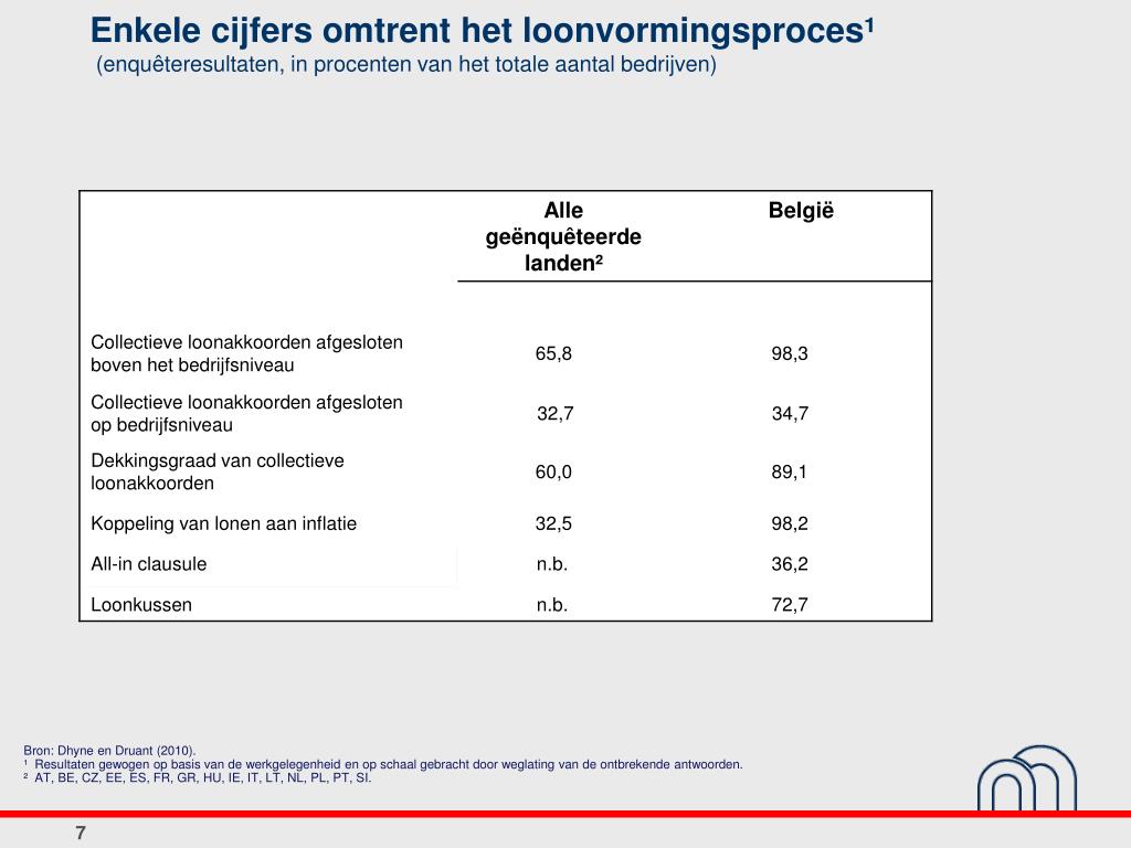 Loonvormingsproces in BelgiëHiërarchische structuur • Nationaal niveau (Nationale Arbeidsraad): collectieve arbeidsovereenkomsten (CAO's) en interprofessionele of centrale akkoorden (IPA's) • bepalen van de loonnorm (tweejaarlijkse akkoorden) • afstemmen loonevolutie op 3 belangrijkste handelspartners (DE, FR en NL) • gewaarborgd gemiddeld minimum maandinkomen (GGMMI) • Sectoraal niveau (paritaire comités): CAO's • invulling van de loonnorm: reële conventionele verhogingen • vastleggen indexeringsmodaliteiten • eventuele all-in clausules • bepalen functieclassificaties met overeenstemmende loonschalen en minimumlonen • Ondernemingsniveau • eventueel bijkomend collectief akkoord • eventueel afwijkende loonschalen