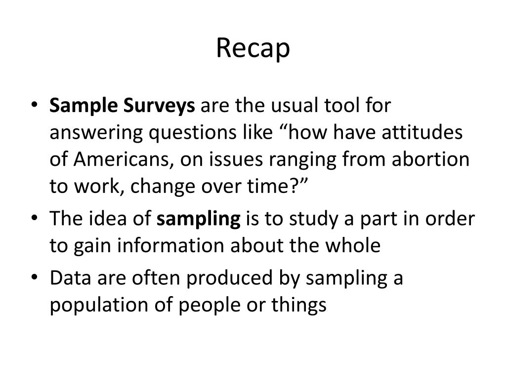 Recap • Sample Surveys are the usual tool for answering questions like “how have attitudes of Americans, on issues ranging from abortion to work, change over time?” • The idea of sampling is to study a part in order to gain information about the whole • Data are often produced by sampling a population of people or things