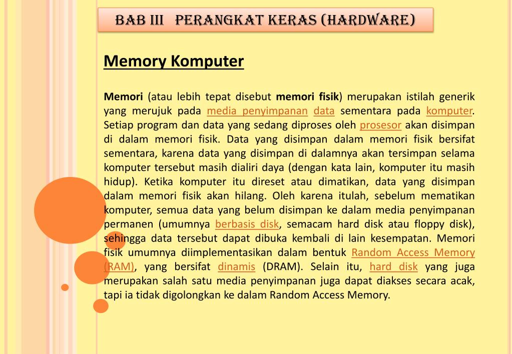 BAB III PERANGKAT KERAS (HARDWARE) Memory Komputer Memori (ataulebihtepatdisebutmemorifisik) merupakanistilahgenerik yang merujukpadamedia penyimpanandatasementarapadakomputer. Setiap program dan data yang sedangdiprosesolehprosesorakandisimpandidalammemorifisik. Data yang disimpandalammemorifisikbersifatsementara, karena data yang disimpandidalamnyaakantersimpanselamakomputertersebutmasihdialiridaya (dengankata lain, komputeritumasihhidup). Ketikakomputeritudiresetataudimatikan, data yang disimpandalammemorifisikakanhilang. Olehkarenaitulah, sebelummematikankomputer, semua data yang belumdisimpankedalam media penyimpananpermanen (umumnyaberbasis disk, semacam hard disk atau floppy disk), sehingga data tersebutdapatdibukakembalidi lain kesempatan. MemorifisikumumnyadiimplementasikandalambentukRandom Access Memory (RAM), yang bersifatdinamis (DRAM). Selainitu, hard disk yang jugamerupakansalahsatu media penyimpananjugadapatdiaksessecaraacak, tapiiatidakdigolongkankedalam Random Access Memory.