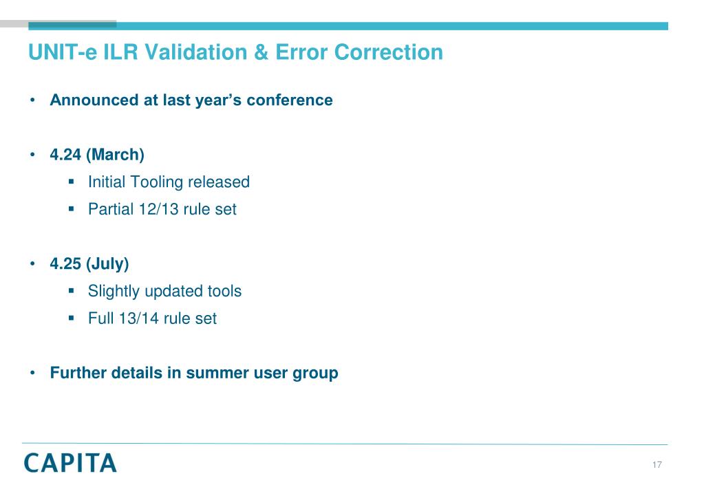 UNIT-e ILR Validation & Error Correction • Announced at last year’s conference • 4.24 (March) • Initial Tooling released • Partial 12/13 rule set • 4.25 (July) • Slightly updated tools • Full 13/14 rule set • Further details in summer user group
