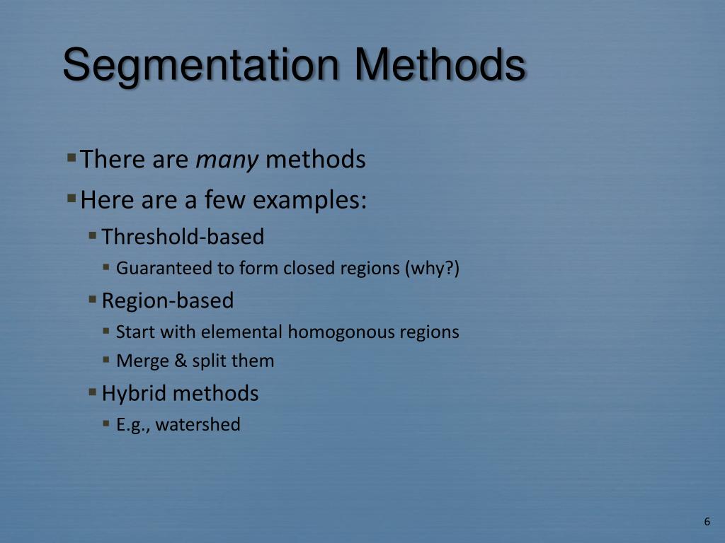 Segmentation Methods • There are many methods • Here are a few examples: • Threshold-based • Guaranteed to form closed regions (why?) • Region-based • Start with elemental homogonous regions • Merge & split them • Hybrid methods • E.g., watershed