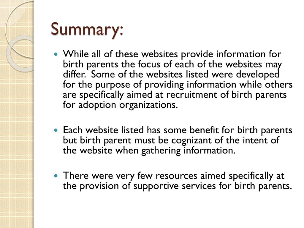 Summary: • While all of these websites provide information for birth parents the focus of each of the websites may differ. Some of the websites listed were developed for the purpose of providing information while others are specifically aimed at recruitment of birth parents for adoption organizations. • Each website listed has some benefit for birth parents but birth parent must be cognizant of the intent of the website when gathering information. • There were very few resources aimed specifically at the provision of supportive services for birth parents.