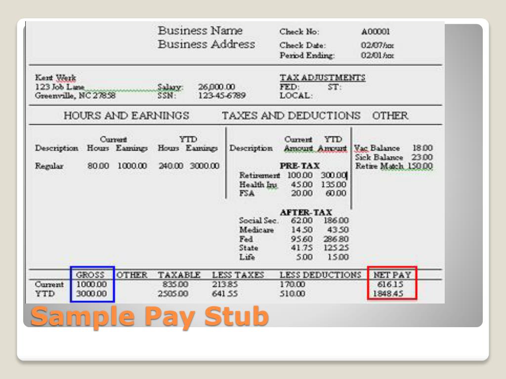 Reading a Paycheck - Terms • Gross pay – total amount earned before deductions are subtracted • Pay rate x Hours worked = gross pay • Yearly salary = gross pay • Don’t forget about your overtime pay! • Net pay– your “take home” pay. The amount received after all deductions have been made • Deductions – state tax, federal tax, SS tax, Medicare tax, state disability tax, unemployment tax (required) health/life/disability insurance, retirement, your bills, other savings accounts (optional)