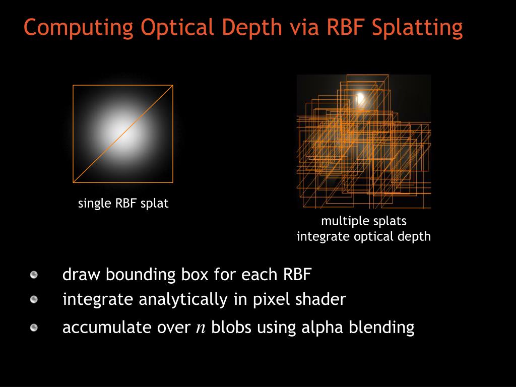 Computing Optical Depth via RBF Splatting single RBF splat multiple splats integrate optical depth draw bounding box for each RBF integrate analytically in pixel shader accumulate over n blobs using alpha blending