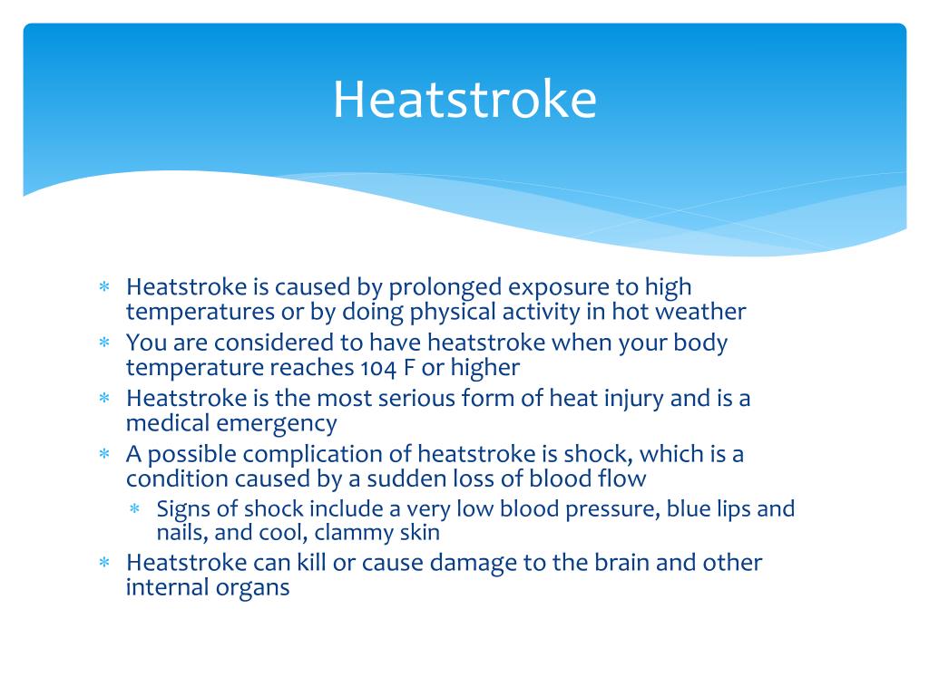 Heatstroke • Heatstroke is caused by prolonged exposure to high temperatures or by doing physical activity in hot weather • You are considered to have heatstroke when your body temperature reaches 104 F or higher • Heatstroke is the most serious form of heat injury and is a medical emergency • A possible complication of heatstroke is shock, which is a condition caused by a sudden loss of blood flow • Signs of shock include a very low blood pressure, blue lips and nails, and cool, clammy skin • Heatstroke can kill or cause damage to the brain and other internal organs