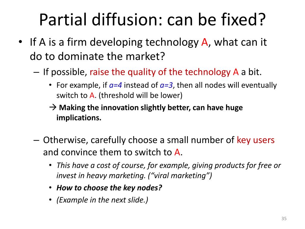 Partial diffusion: can be fixed? • If A is a firm developing technology A, what can it do to dominate the market? • If possible, raise the quality of the technology Aa bit. • For example, if a=4 instead of a=3, then all nodes will eventually switch to A. (threshold will be lower) Making the innovation slightly better, can have huge implications. • Otherwise, carefully choose a small number of key users and convince them to switch to A. • This have a cost of course, for example, giving products for free or invest in heavy marketing. (“viral marketing”) • How to choose the key nodes? • (Example in the next slide.)