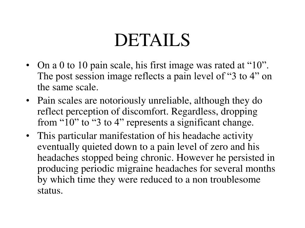 DETAILS • On a 0 to 10 pain scale, his first image was rated at “10”. The post session image reflects a pain level of “3 to 4” on the same scale. • Pain scales are notoriously unreliable, although they do reflect perception of discomfort. Regardless, dropping from “10” to “3 to 4” represents a significant change. • This particular manifestation of his headache activity eventually quieted down to a pain level of zero and his headaches stopped being chronic. However he persisted in producing periodic migraine headaches for several months by which time they were reduced to a non troublesome status.