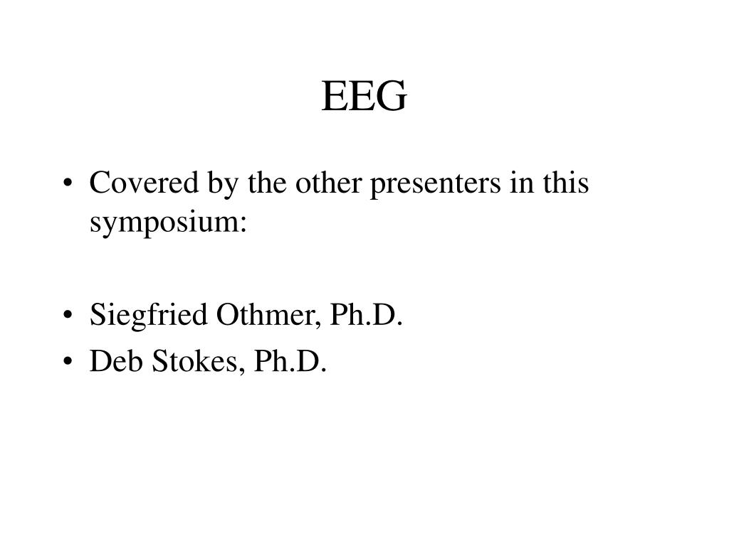 EEG • Covered by the other presenters in this symposium: • Siegfried Othmer, Ph.D. • Deb Stokes, Ph.D.