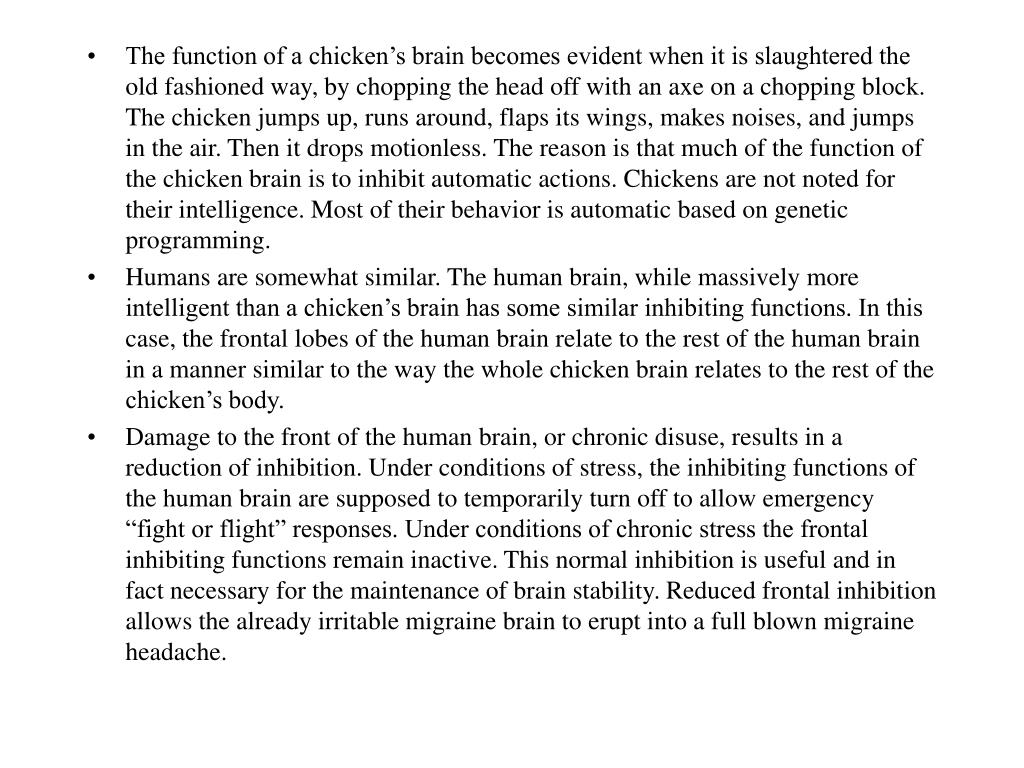 The function of a chicken’s brain becomes evident when it is slaughtered the old fashioned way, by chopping the head off with an axe on a chopping block. The chicken jumps up, runs around, flaps its wings, makes noises, and jumps in the air. Then it drops motionless. The reason is that much of the function of the chicken brain is to inhibit automatic actions. Chickens are not noted for their intelligence. Most of their behavior is automatic based on genetic programming. • Humans are somewhat similar. The human brain, while massively more intelligent than a chicken’s brain has some similar inhibiting functions. In this case, the frontal lobes of the human brain relate to the rest of the human brain in a manner similar to the way the whole chicken brain relates to the rest of the chicken’s body. • Damage to the front of the human brain, or chronic disuse, results in a reduction of inhibition. Under conditions of stress, the inhibiting functions of the human brain are supposed to temporarily turn off to allow emergency “fight or flight” responses. Under conditions of chronic stress the frontal inhibiting functions remain inactive. This normal inhibition is useful and in fact necessary for the maintenance of brain stability. Reduced frontal inhibition allows the already irritable migraine brain to erupt into a full blown migraine headache.