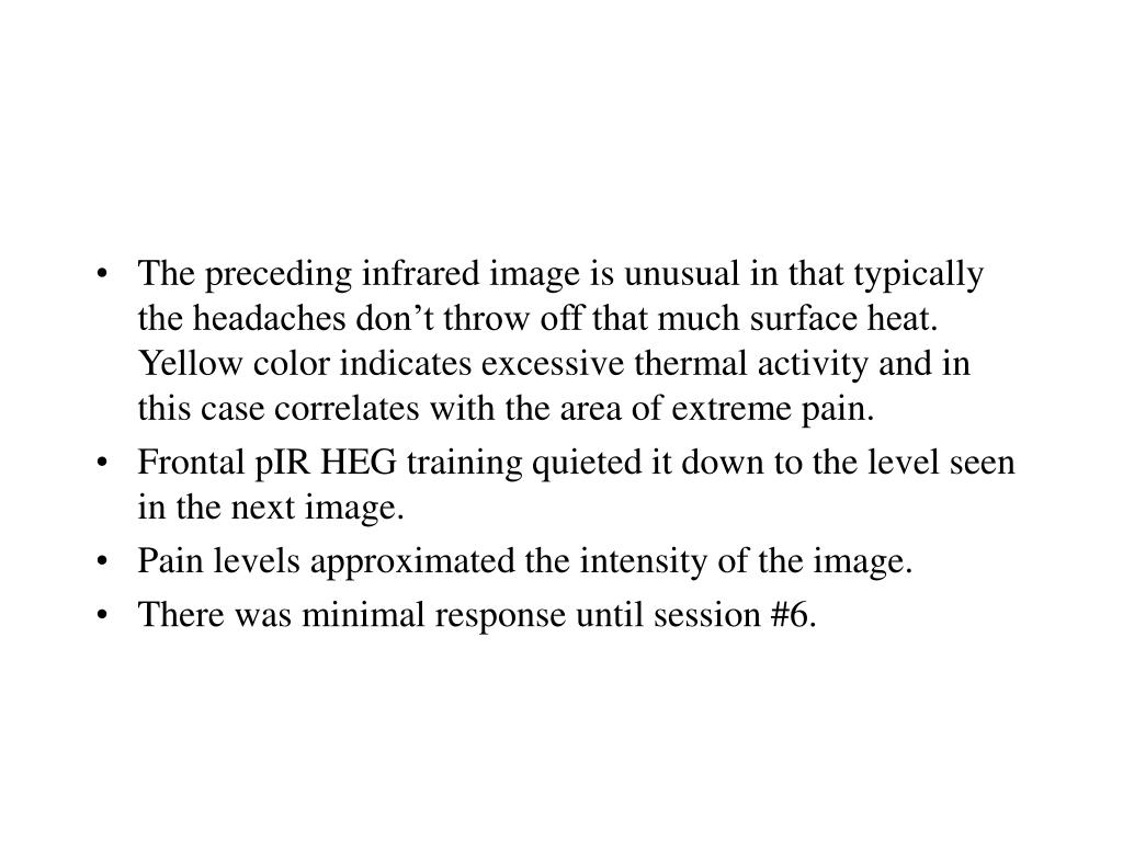 The preceding infrared image is unusual in that typically the headaches don’t throw off that much surface heat. Yellow color indicates excessive thermal activity and in this case correlates with the area of extreme pain. • Frontal pIR HEG training quieted it down to the level seen in the next image. • Pain levels approximated the intensity of the image. • There was minimal response until session #6.
