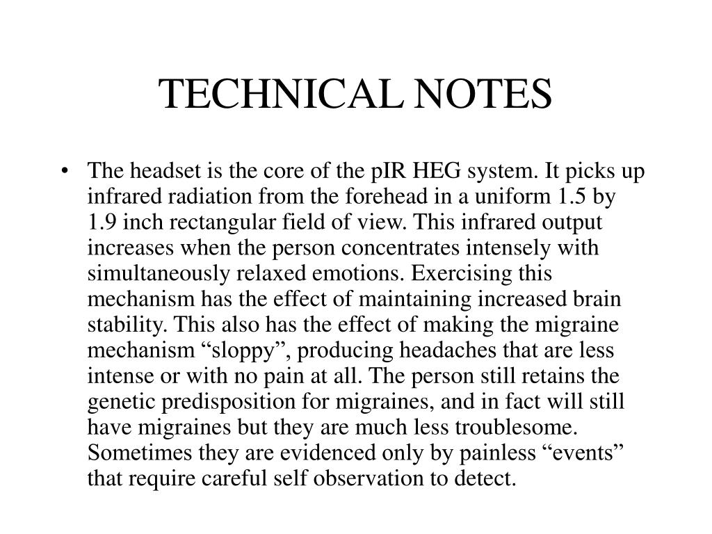 TECHNICAL NOTES • The headset is the core of the pIR HEG system. It picks up infrared radiation from the forehead in a uniform 1.5 by 1.9 inch rectangular field of view. This infrared output increases when the person concentrates intensely with simultaneously relaxed emotions. Exercising this mechanism has the effect of maintaining increased brain stability. This also has the effect of making the migraine mechanism “sloppy”, producing headaches that are less intense or with no pain at all. The person still retains the genetic predisposition for migraines, and in fact will still have migraines but they are much less troublesome. Sometimes they are evidenced only by painless “events” that require careful self observation to detect.