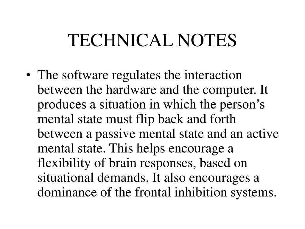 TECHNICAL NOTES • The software regulates the interaction between the hardware and the computer. It produces a situation in which the person’s mental state must flip back and forth between a passive mental state and an active mental state. This helps encourage a flexibility of brain responses, based on situational demands. It also encourages a dominance of the frontal inhibition systems.