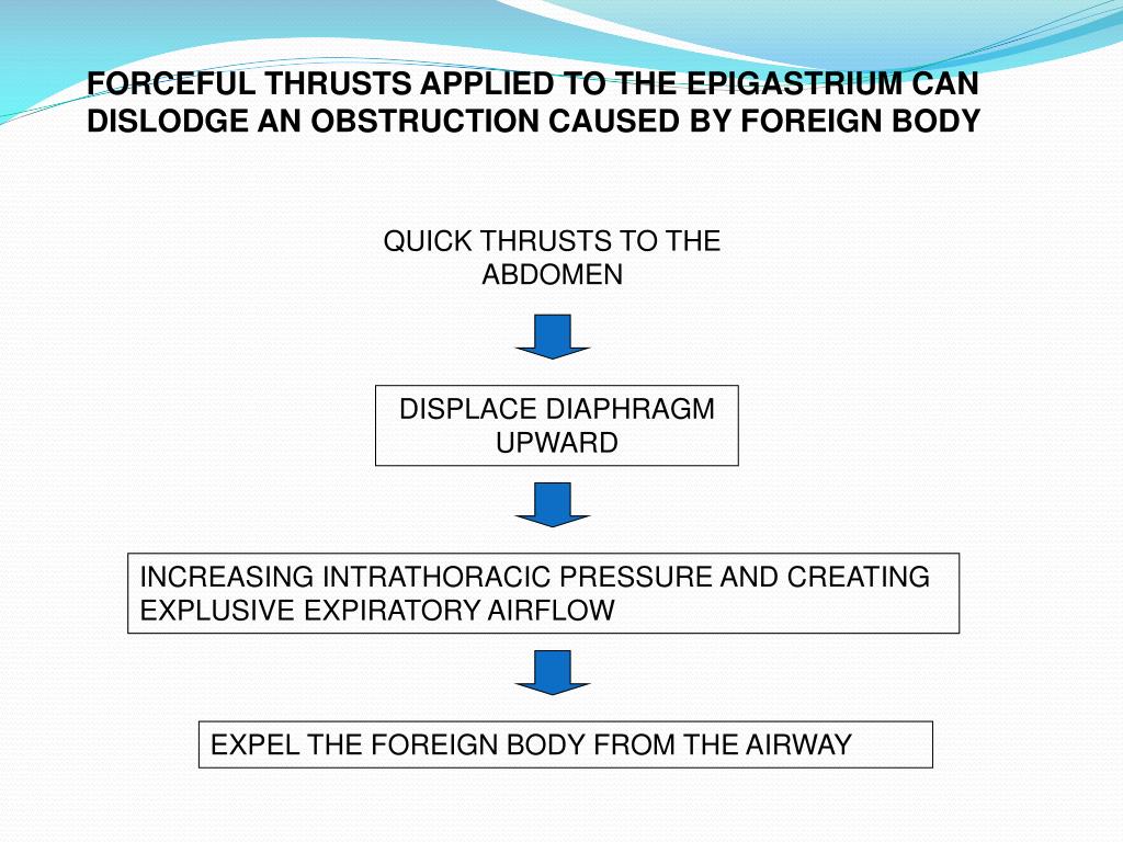 FORCEFUL THRUSTS APPLIED TO THE EPIGASTRIUM CAN DISLODGE AN OBSTRUCTION CAUSED BY FOREIGN BODY QUICK THRUSTS TO THE ABDOMEN DISPLACE DIAPHRAGM UPWARD INCREASING INTRATHORACIC PRESSURE AND CREATING EXPLUSIVE EXPIRATORY AIRFLOW EXPEL THE FOREIGN BODY FROM THE AIRWAY