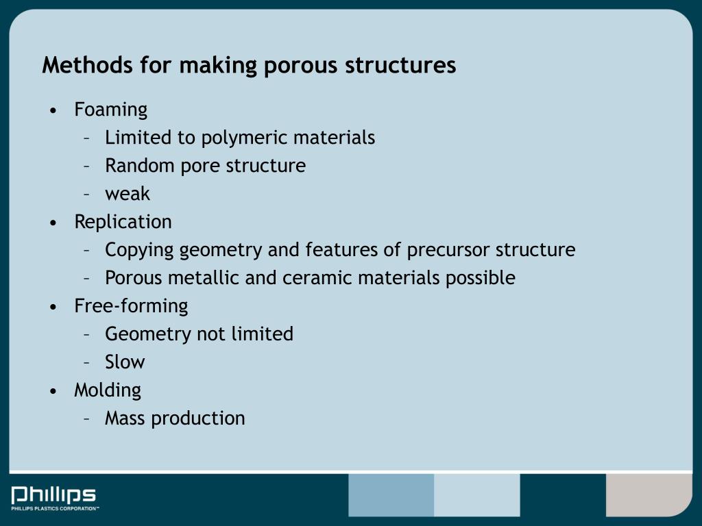 Scaffold Materials and Structures. M. Entezarian, Dick Smasal, Brad Heckendorf Phillips Plastics Corporation. Methods for making porous structures. Foaming Limited to polymeric materials Random pore structure weak Replication Copying geometry and features of precursor structure