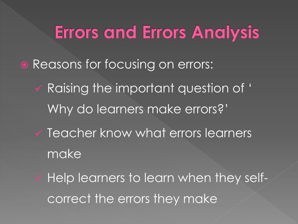 Errors and Errors Analysis • Reasons for focusing on errors: • Raising the important question of ‘ Why do learners make errors?’ • Teacher know what errors learners make • Help learners to learn when they self-correct the errors they make