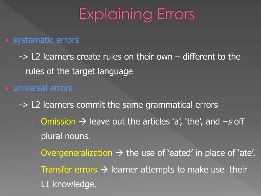 Explaining Errors • systematicerrors -> L2 learners create rules on their own – different to the rules of the target language • universalerrors -> L2 learners commit the same grammatical errors • Omission leave out the articles ‘a’, ‘the’, and –s off plural nouns. • Overgeneralization the use of ‘eated’ in place of ‘ate’. • Transfererrors learner attempts to make use their L1 knowledge.