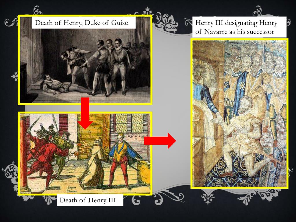 Death of Henry, Duke of Guise Henry III designating Henry of Navarre as his successor Death of Henry III