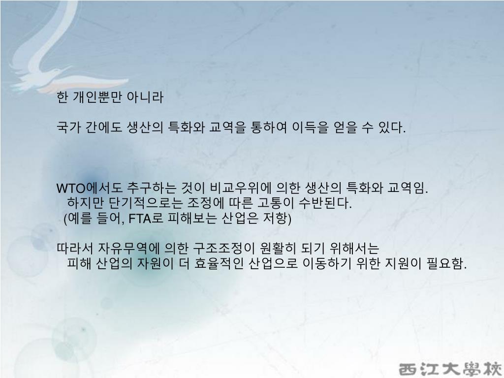 한 개인뿐만 아니라 국가 간에도 생산의 특화와 교역을 통하여 이득을 얻을 수 있다. WTO에서도 추구하는 것이 비교우위에 의한 생산의 특화와 교역임. 하지만 단기적으로는 조정에 따른 고통이 수반된다. (예를 들어, FTA로 피해보는 산업은 저항) 따라서 자유무역에 의한 구조조정이 원활히 되기 위해서는 피해 산업의 자원이 더 효율적인 산업으로 이동하기 위한 지원이 필요함.