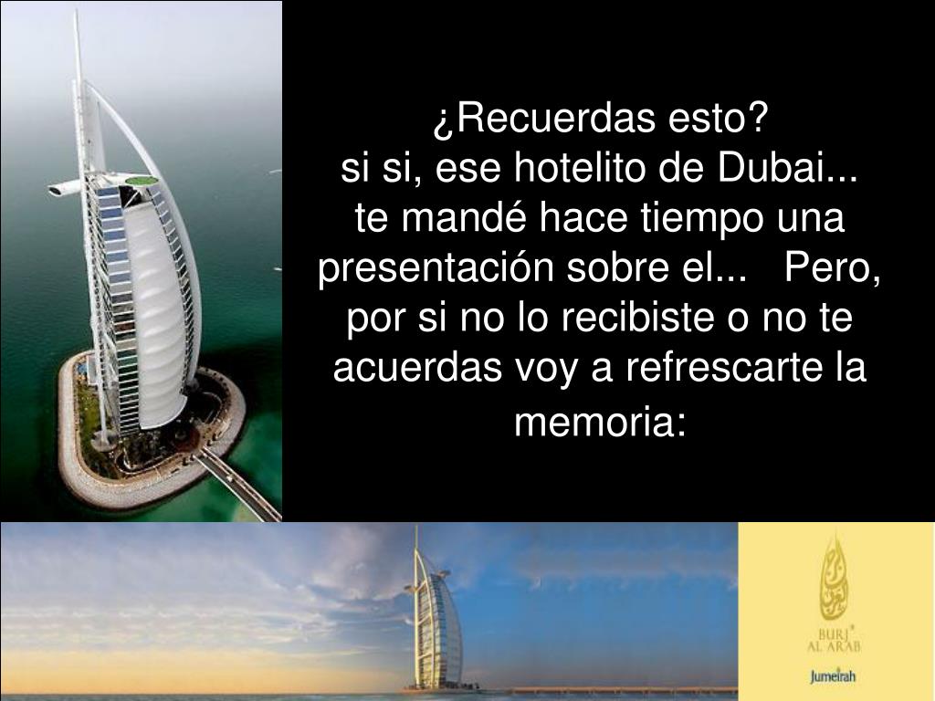 ¿Recuerdas esto? si si, ese hotelito de Dubai... te mandé hace tiempo una presentación sobre el... Pero, por si no lo recibiste o no te acuerdas voy a refrescarte la memoria: