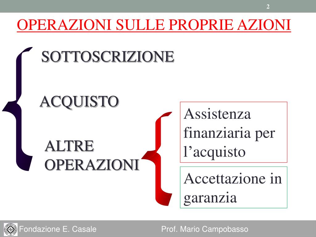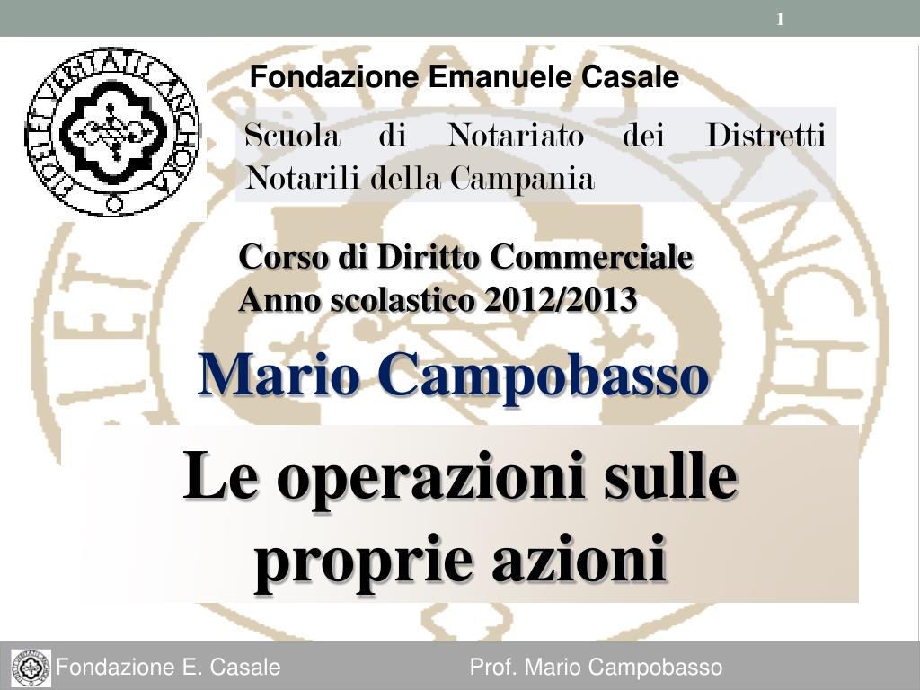 Fondazione Emanuele Casale. Scuola di Notariato dei Distretti Notarili della Campania . Corso di Diritto Commerciale Anno scolastico 2012/2013. Mario Campobasso. Le operazioni sulle proprie azioni. OPERAZIONI SULLE PROPRIE AZIONI. SOTTOSCRIZIONE. ACQUISTO.