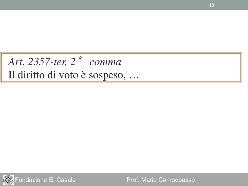 Art. 2357-ter, 2° comma Il diritto di voto è sospeso, ma le azioni proprie sono tuttavia computate ai fini del calcolo delle maggioranze e delle quote richieste per la costituzione e per le deliberazioni dell'assemblea. Nelle società che fanno ricorso al mercato del capitale di rischio il computo delle azioni proprie è disciplinato dall'articolo 2368, terzo comma