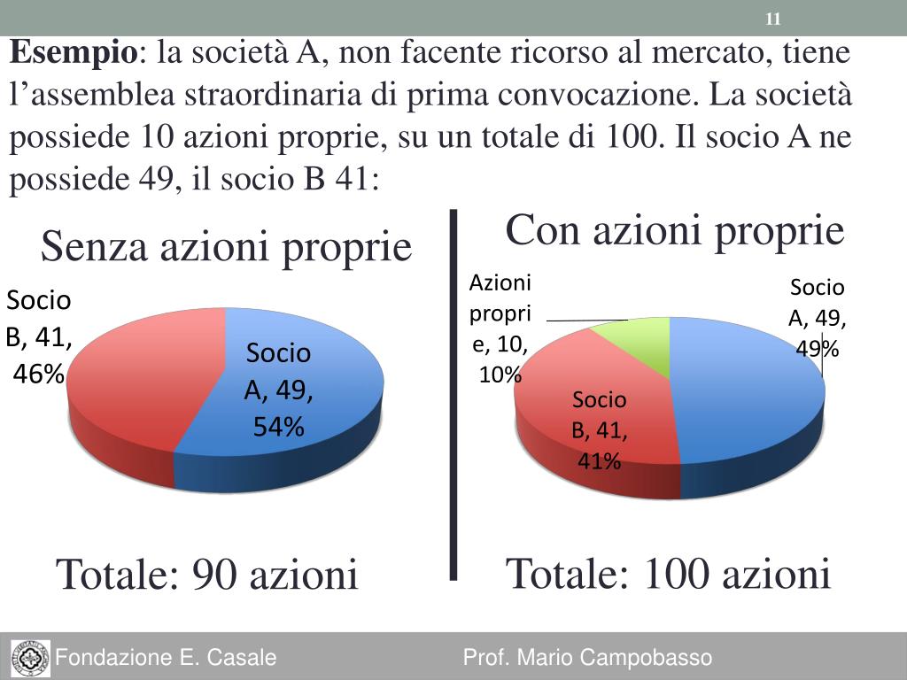 Esempio: la società A, non facente ricorso al mercato, tiene l’assemblea straordinaria di prima convocazione. La società possiede 10 azioni proprie, su un totale di 100. Il socio A ne possiede 49, il socio B 41: Con azioni proprie Senza azioni proprie Totale: 100 azioni Totale: 90 azioni