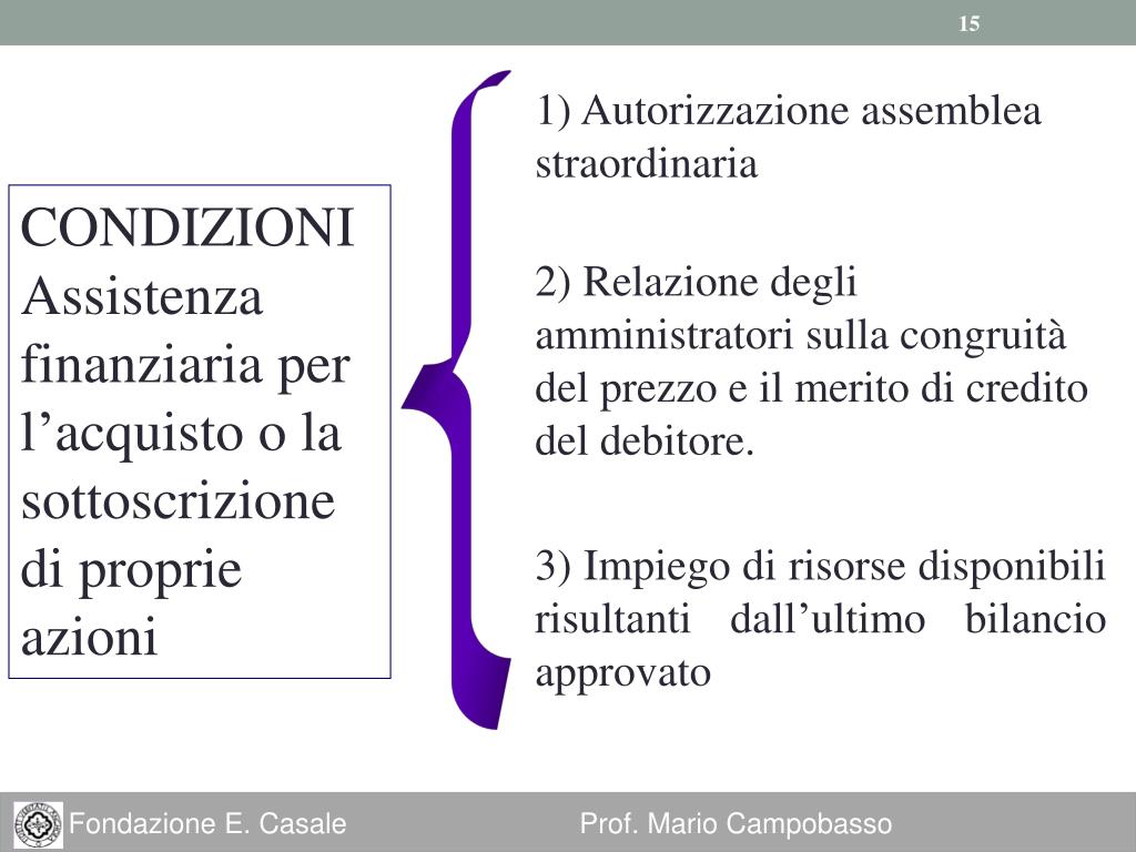 1) Autorizzazione assemblea straordinaria CONDIZIONI Assistenza finanziaria per l’acquisto o la sottoscrizione di proprie azioni 2) Relazione degli amministratori sulla congruità del prezzo e il merito di credito del debitore. 3) Impiego di risorse disponibili risultanti dall’ultimo bilancio approvato
