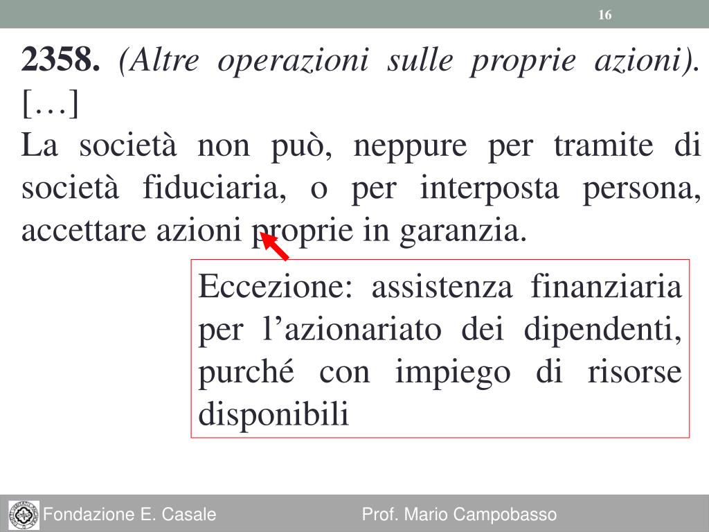 2358. (Altre operazioni sulle proprie azioni). […] La società non può, neppure per tramite di società fiduciaria, o per interposta persona, accettare azioni proprie in garanzia. Eccezione: assistenza finanziaria per l’azionariato dei dipendenti, purché con impiego di risorse disponibili
