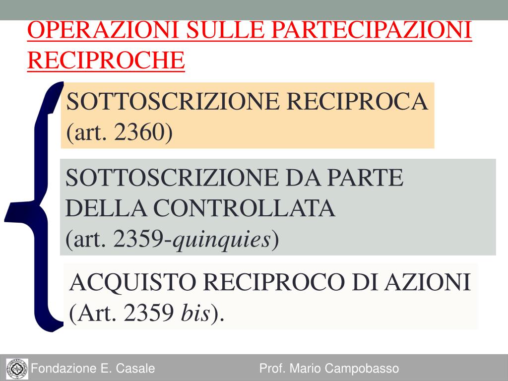 OPERAZIONI SULLE PARTECIPAZIONI RECIPROCHE SOTTOSCRIZIONE RECIPROCA (art. 2360) SOTTOSCRIZIONE DA PARTE DELLA CONTROLLATA (art. 2359-quinquies) ACQUISTO RECIPROCO DI AZIONI (Art. 2359 bis).