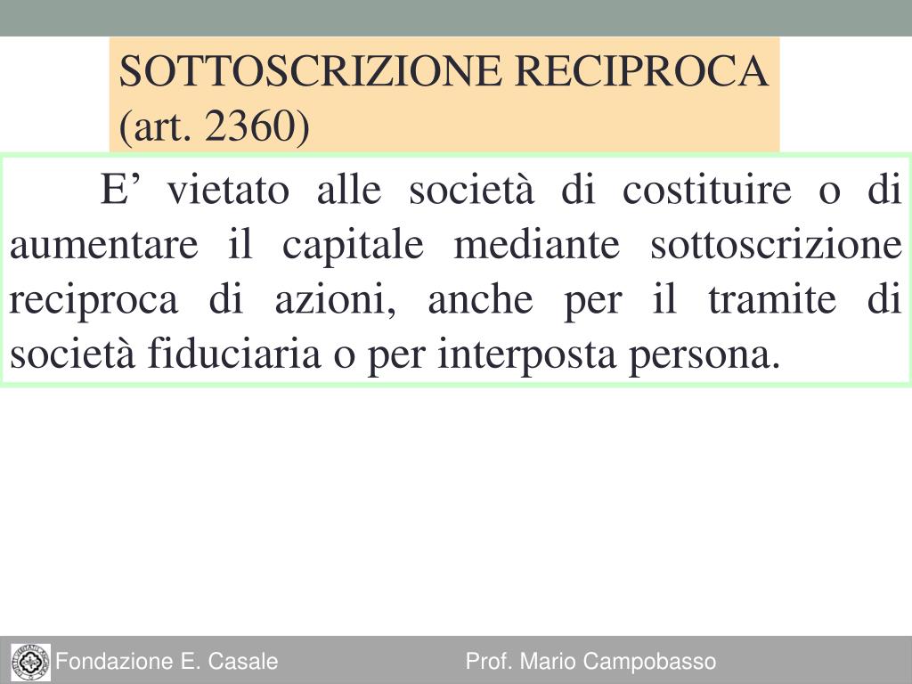 SOTTOSCRIZIONE RECIPROCA (art. 2360) E’ vietato alle società di costituire o di aumentare il capitale mediante sottoscrizione reciproca di azioni, anche per il tramite di società fiduciaria o per interposta persona.