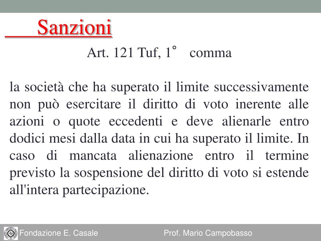 Sanzioni Art. 121 Tuf, 1° comma la società che ha superato il limite successivamente non può esercitare il diritto di voto inerente alle azioni o quote eccedenti e deve alienarle entro dodici mesi dalla data in cui ha superato il limite. In caso di mancata alienazione entro il termine previsto la sospensione del diritto di voto si estende all'intera partecipazione.