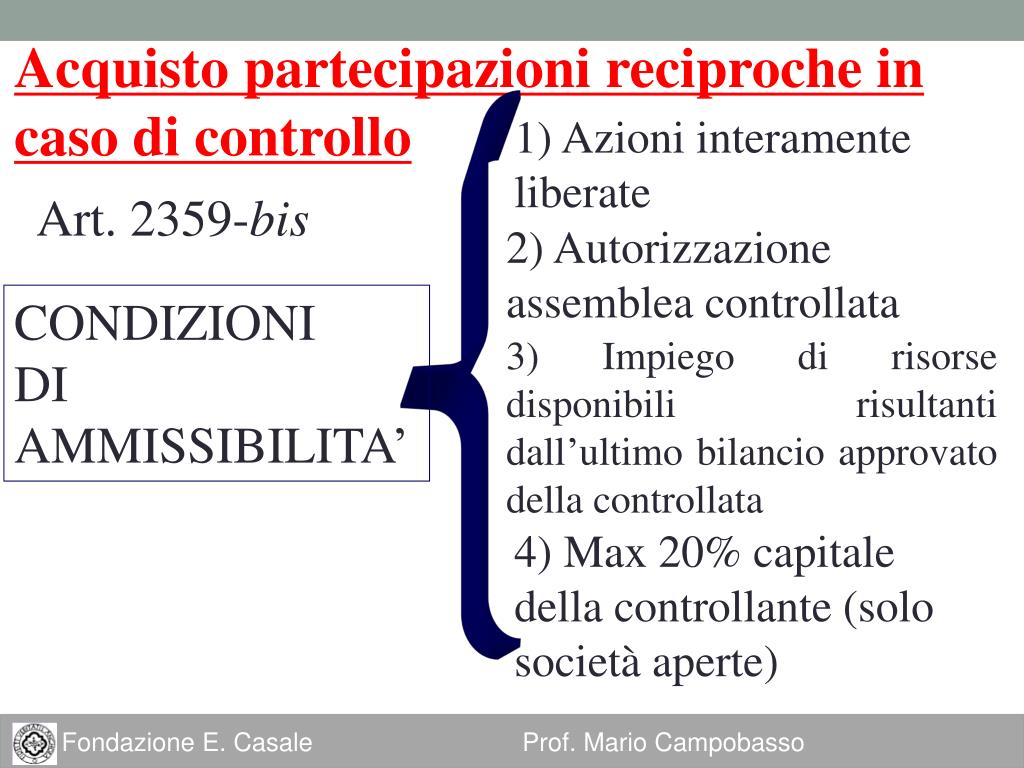 Acquisto partecipazioni reciproche in caso di controllo 1) Azioni interamente liberate Art. 2359-bis 2) Autorizzazione assemblea controllata CONDIZIONI DI AMMISSIBILITA’ 3) Impiego di risorse disponibili risultanti dall’ultimo bilancio approvato della controllata 4) Max 20% capitale della controllante (solo società aperte)