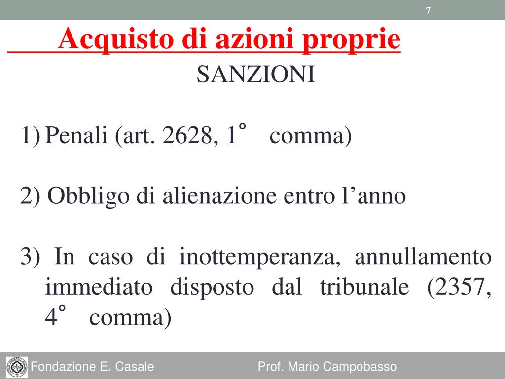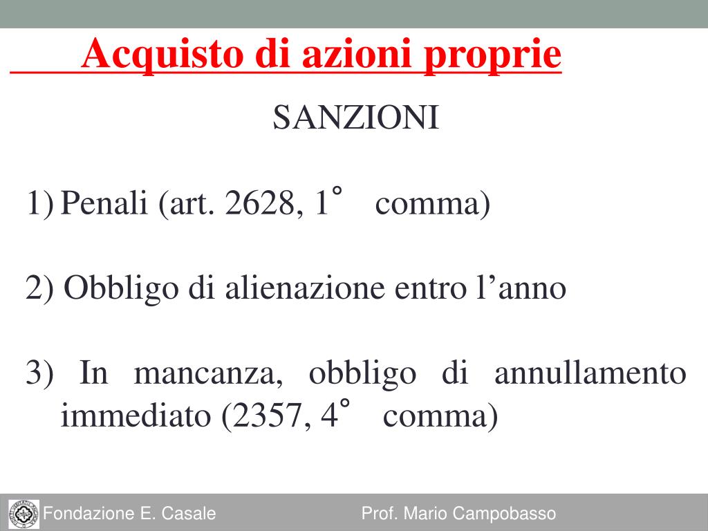 Acquisto di azioni proprie • SANZIONI • Penali (art. 2628, 1° comma) • 2) Obbligo di alienazione entro l’anno • 3) In mancanza, obbligo di annullamento immediato (2357, 4° comma)