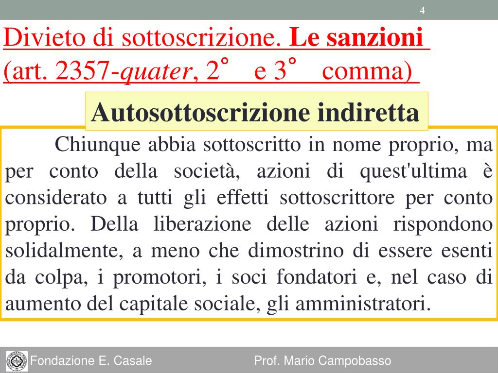 Divieto di sottoscrizione. Le sanzioni (art. 2357-quater, 2° comma) Autosottoscrizione diretta Le azioni sottoscritte in violazione del divieto stabilito nel precedente comma si intendono sottoscritte e devono essere liberate dai promotori e dai soci fondatori o, in caso di aumento del capitale sociale, dagli amministratori. La presente disposizione non si applica a chi dimostri di essere esente da colpa.